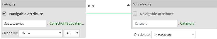 If you check the Navigable attribute, the Attribute will be added into your Class. This will make it accessible in your code. In the example shown above, the Subcategory attribute of the Category class is navigable.