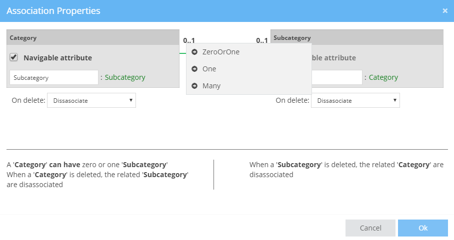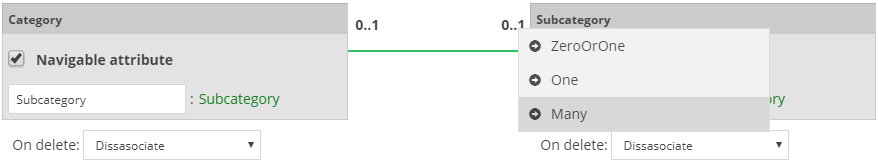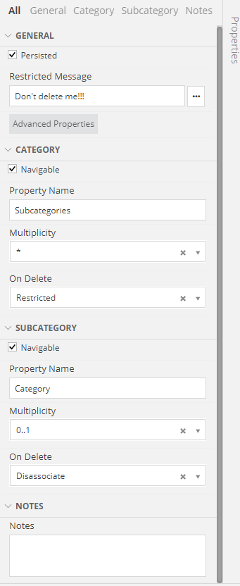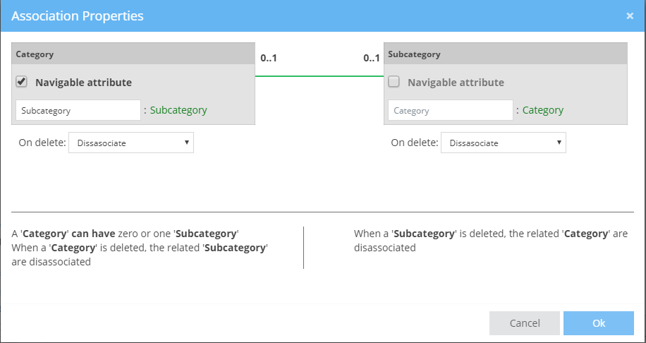 The Association Properties will present the two Classes. For example, in the above Image, we drew a relationship between a Category and a Subcategory.