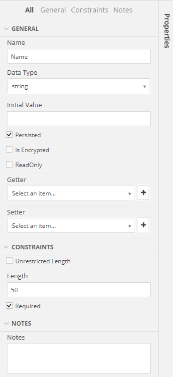 | Initial Value | A value to be used as "default" whenever the Class is being created | Example: Name : string with Initial Value set to "Unknown" |