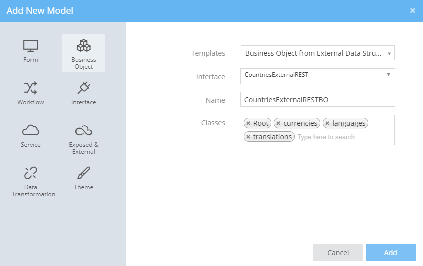 To create a new Business Objects Model, containing your Classes from an External API, you can: