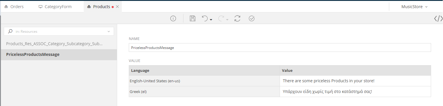 In some cases, you will see some Localization Resource items that where added for you by zAppDev. For example, if you set a message to be displayed whenever a Restricted object is being deleted, the Resource for that message will appear in the Localization tab of the Class' Business Objects Model.