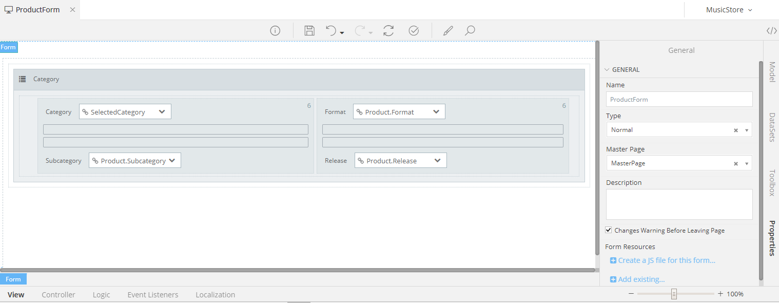 Even though zAppDev gives almost endless functionalities and options to take your Form Model to the next level, it also provides means to extend the embedded functionality of a Form with external or custom-made JavaScripts. To assign one or more JavaScript files to your Form Model, first you will need to select the Form component (as shown in the previous section).