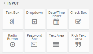 | Input | The Input section contains all those components that can be used to alter the Data of your form (i.e. Textboxes, TextAreas, Date and Time Pickers etc. | Click here | |