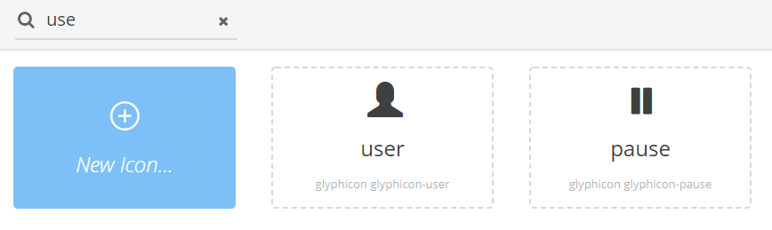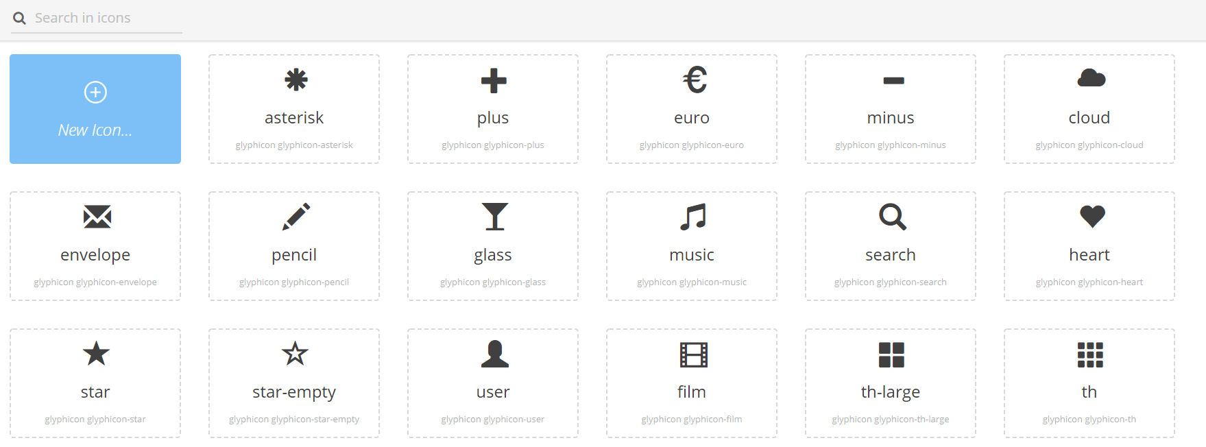 To find an icon, click on the search bar on the top left corner and type in a part of the icon name. As you type, icons will be filtered and only those whose Name or Css Classes contain the typed value will be displayed.