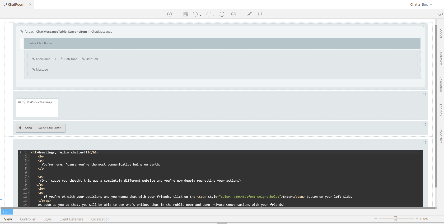 Notice that I played around with the ChatMessage class to show the UserName of the person that send the message, the Date and Time when the Message was sent and I used an HTMLContainer to write a simple message to be shown to those users that are in no mood to chat just yet (in the NotInPublicChatRoomLayout) . Note: You'll notice the "Or hit Ctrl+Enter" message in my button. If you're wondering how to do that, keep reading. We're gonna use the JS API for that, it's gonna be cool.