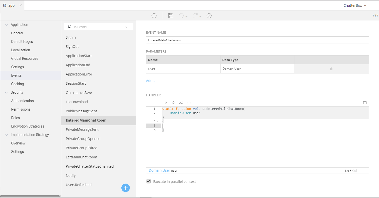 string) or complex objects. To add parameters, simply click on the Add... link. For our event, add one parameter named user with aDomain.UserDataType. Thus, everytime an EnteredMainChatRoom event is risen, the object of the user that has entered the Chat Room will be sent with the event as well - Now, check out the Handler. You can use it to assign a Global handler to be ran throughout your whole Application. We won't need that here.. So, let it empty