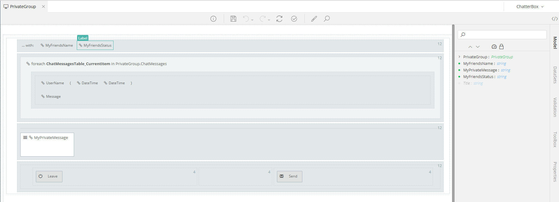 The Private Group will be quite similar to the ChatRoom we created earlier, except for the two Layouts (no need for the NotInPublicChatRoomLayout here) and some additional Model Properties that this Form has. I'm not gonna take you step by step as I did earlier, ok? You're gonna try and create this form by yourself. What I want you to do is the following: 1. Use the Model you've created to create your Form 2. Add one button (that will do nothing, for now) with a "Leave" label 3. Check out what my form looks like and feel free to copy it if you like it